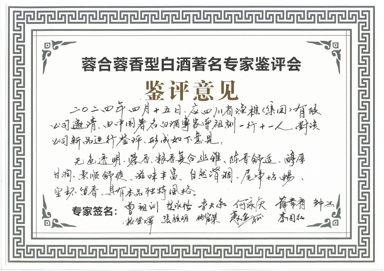 2024年4月15日上午,四川省渔樵(集团)有限公司(以下简称渔樵集团)“蓉合”蓉香型白酒著名专家鉴评会在公司隆重举行。著名白酒专家曾祖训高工、胡永松教授、李大和高工等一行十一人、渔樵集团董事长张成松及集团相关部门负责人出席会议。鉴评环节由著名白酒专家曾祖训高工主持。