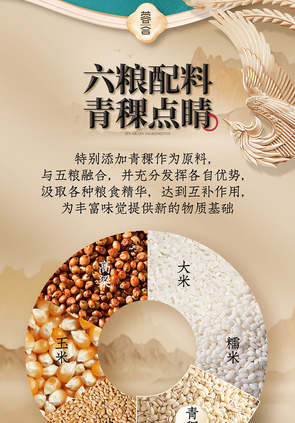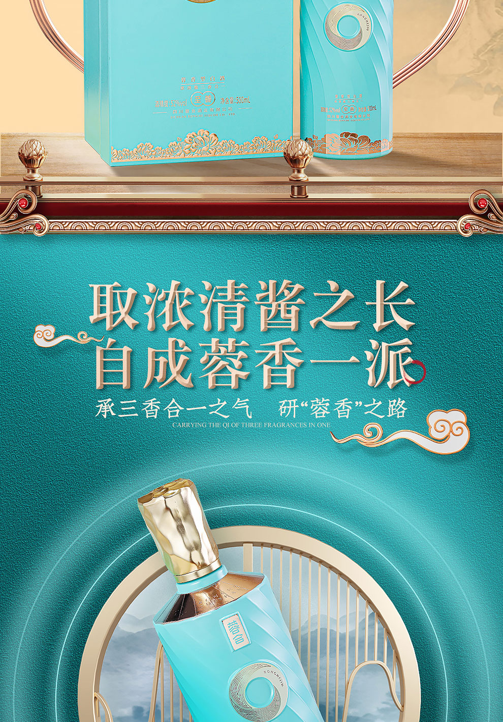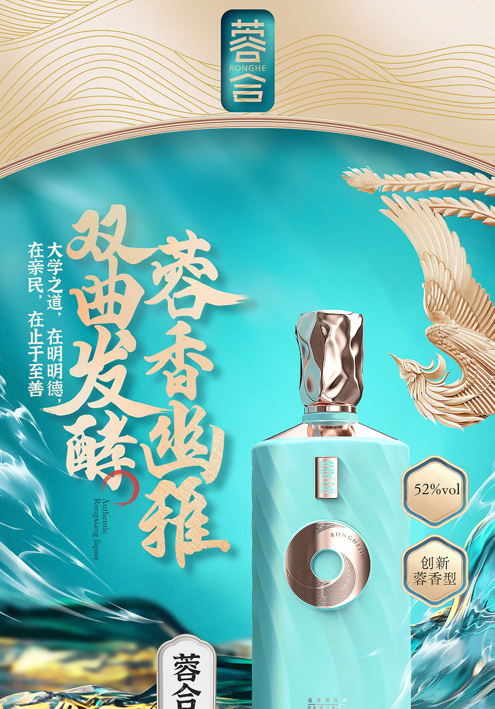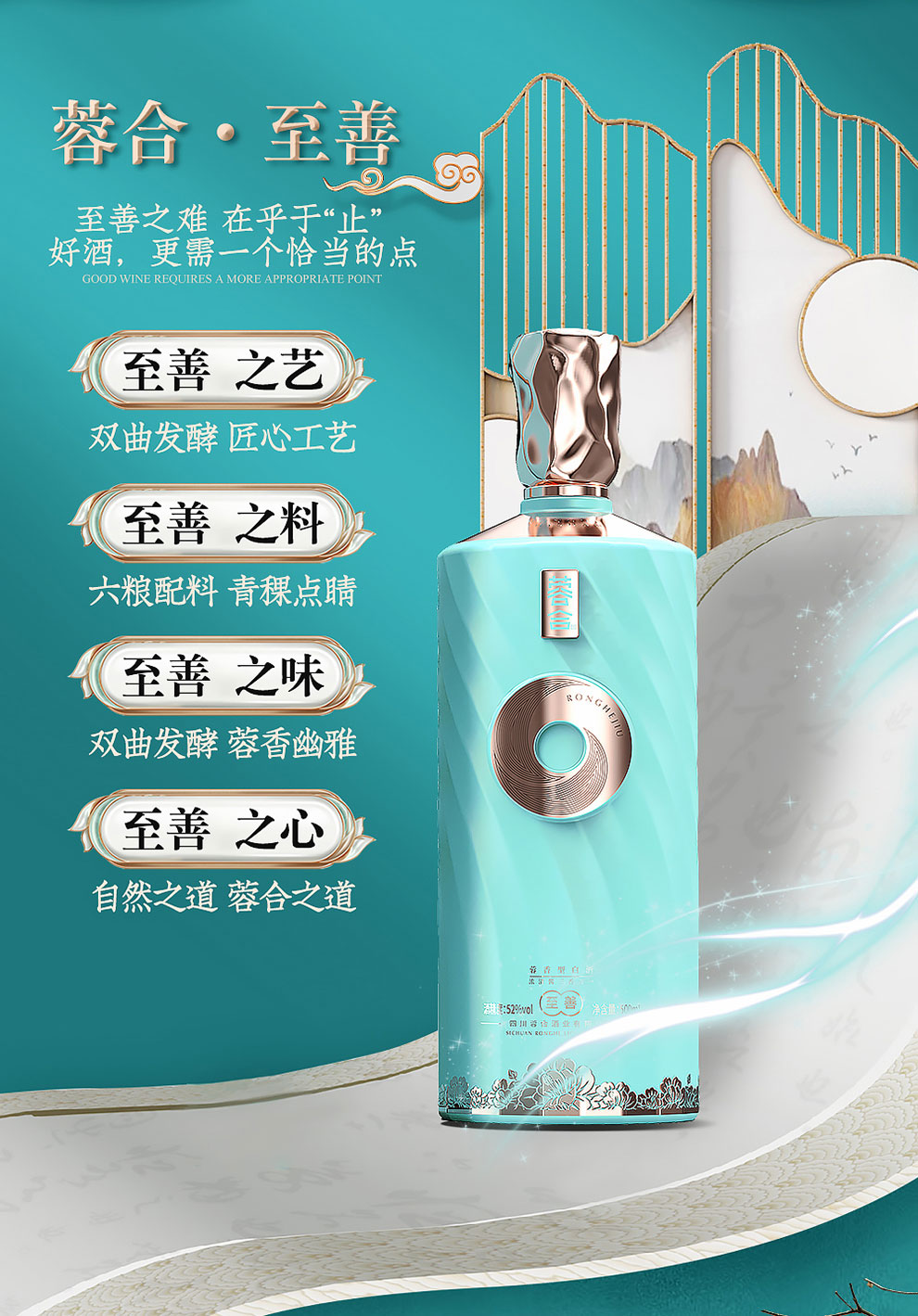 “蓉合”独特的超级视觉符号:蓉合三香环,其灵感来源于古老的金沙图腾太阳神鸟,以立体视觉述说浓清酱“三香合一”,在发酵过程中自然形成蓉香型白酒独特风格。蓉合莫比乌斯环:蓉合酿酒工艺传承与发展周而复始,生生不息。