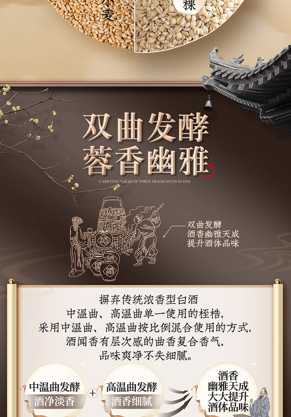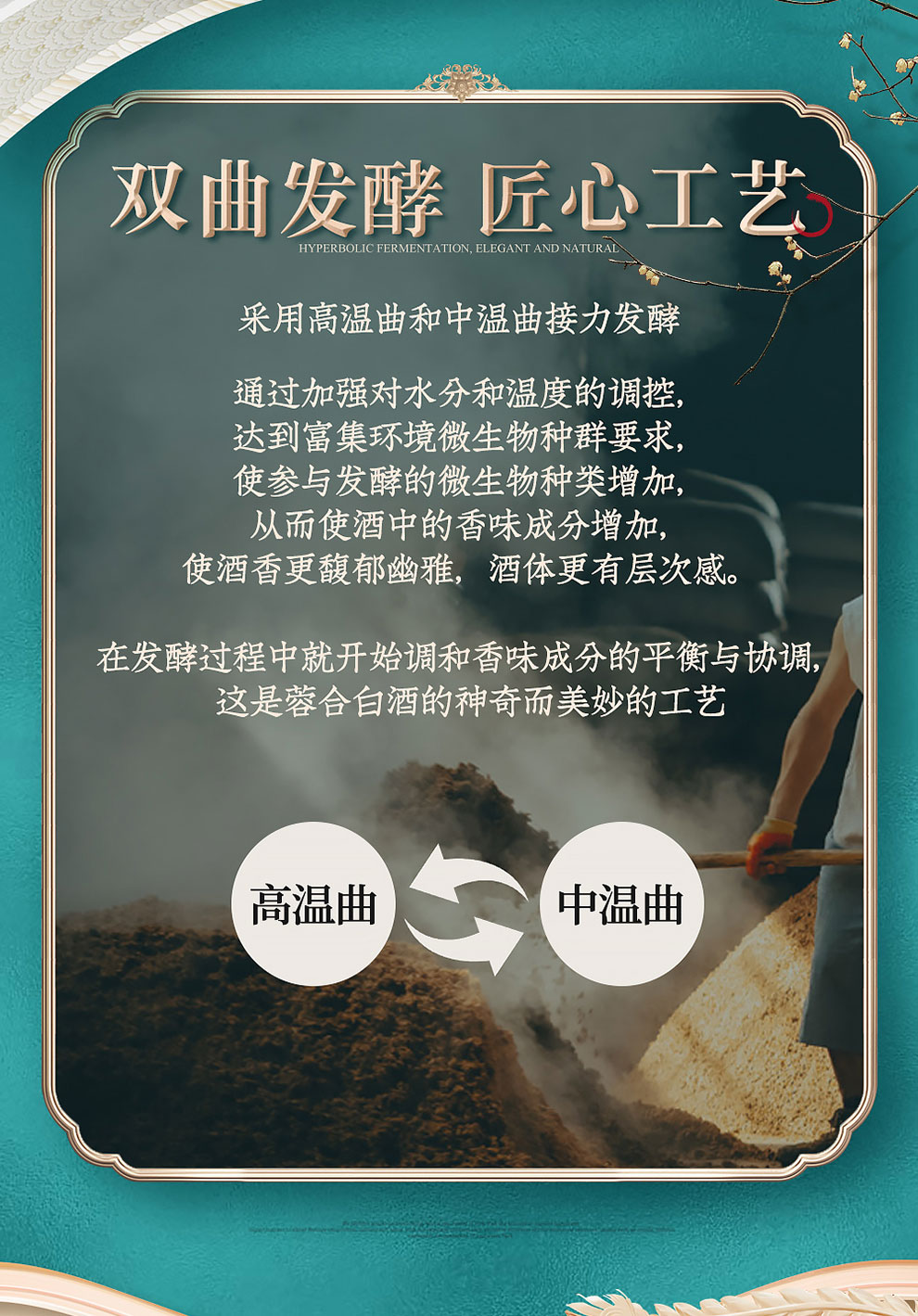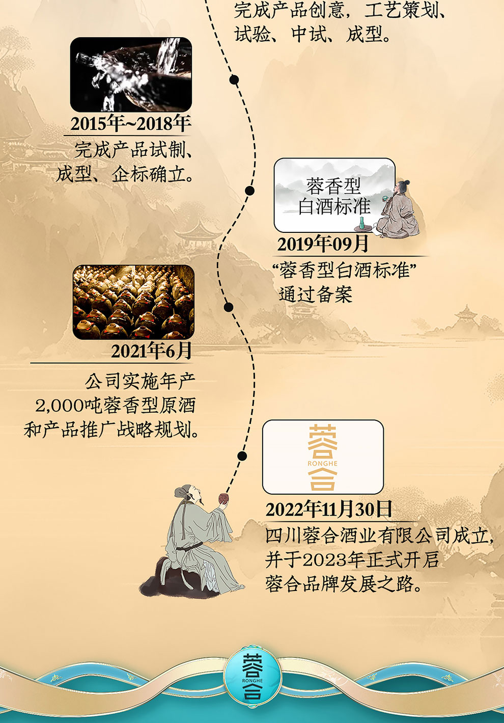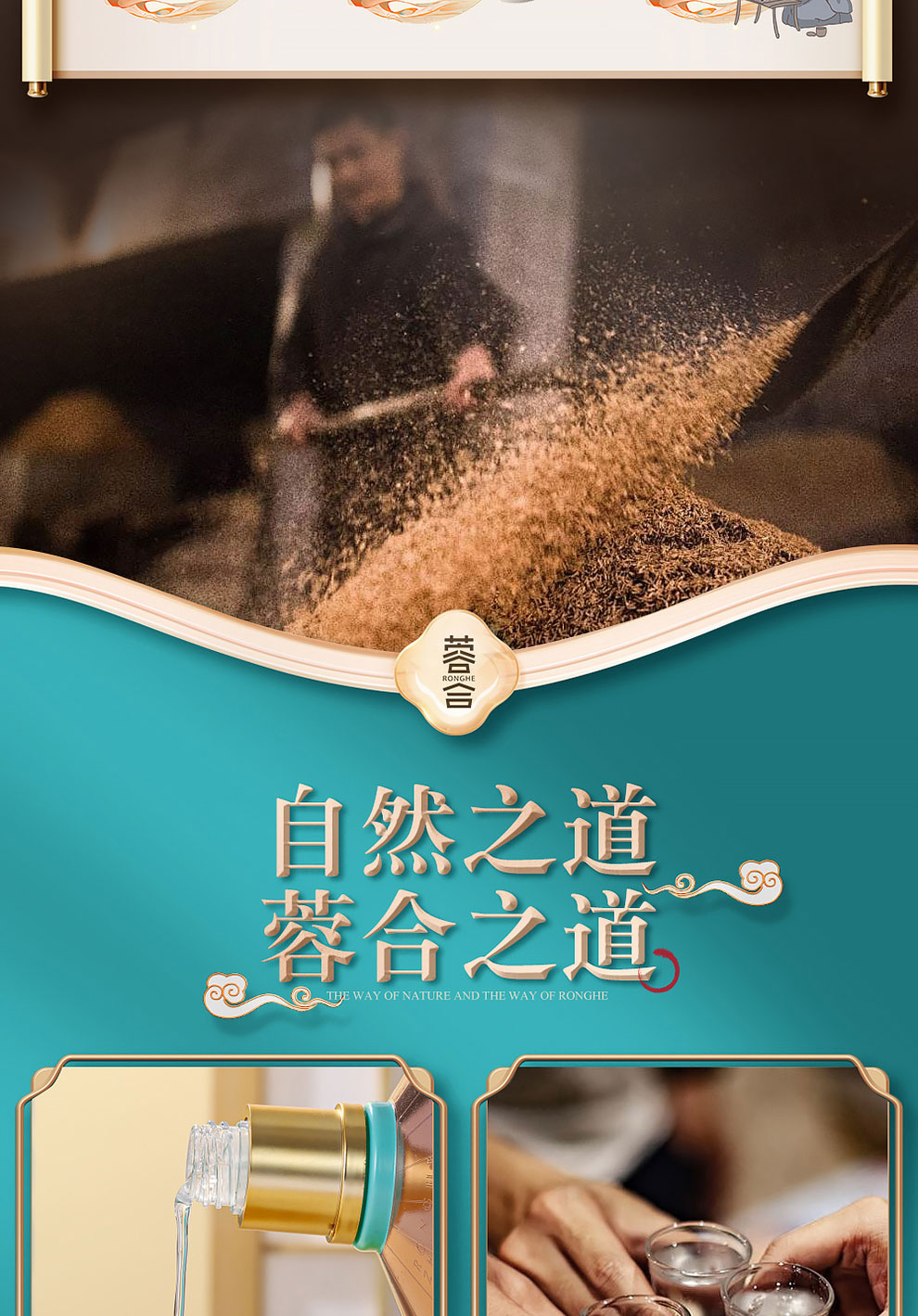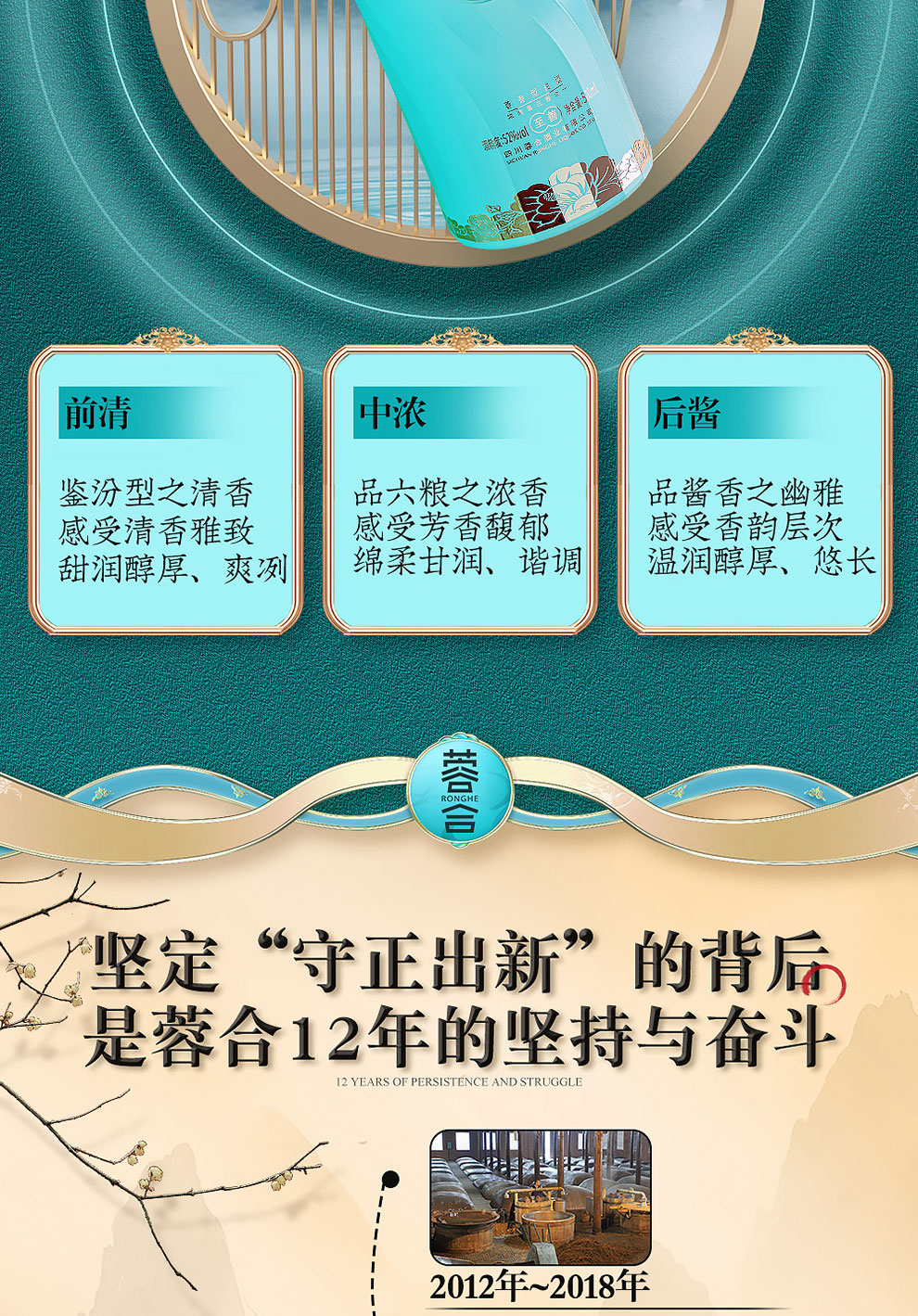 “蓉合”独特的超级视觉符号:蓉合三香环,其灵感来源于古老的金沙图腾太阳神鸟,以立体视觉述说浓清酱“三香合一”,在发酵过程中自然形成蓉香型白酒独特风格。蓉合莫比乌斯环:蓉合酿酒工艺传承与发展周而复始,生生不息。