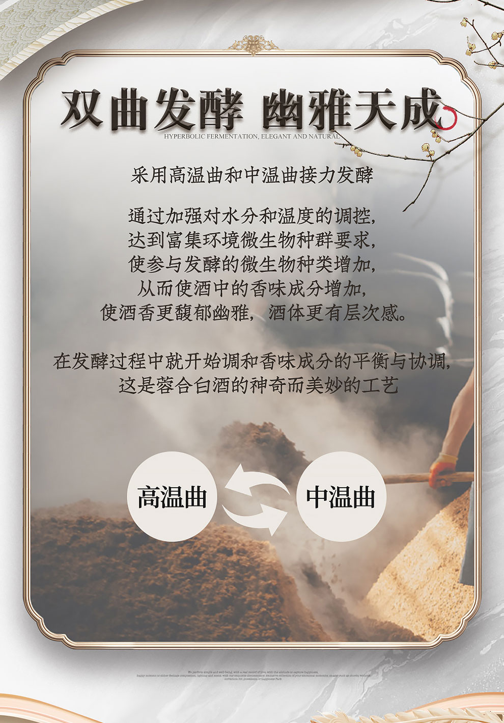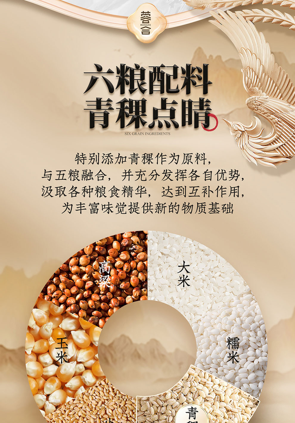 “蓉合”独特的超级视觉符号:蓉合三香环,其灵感来源于古老的金沙图腾太阳神鸟,以立体视觉述说浓清酱“三香合一”,在发酵过程中自然形成蓉香型白酒独特风格。蓉合莫比乌斯环:蓉合酿酒工艺传承与发展周而复始,生生不息。