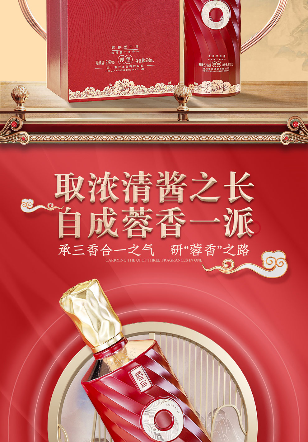 “蓉合”独特的超级视觉符号:蓉合三香环,其灵感来源于古老的金沙图腾太阳神鸟,以立体视觉述说浓清酱“三香合一”,在发酵过程中自然形成蓉香型白酒独特风格。蓉合莫比乌斯环:蓉合酿酒工艺传承与发展周而复始,生生不息。