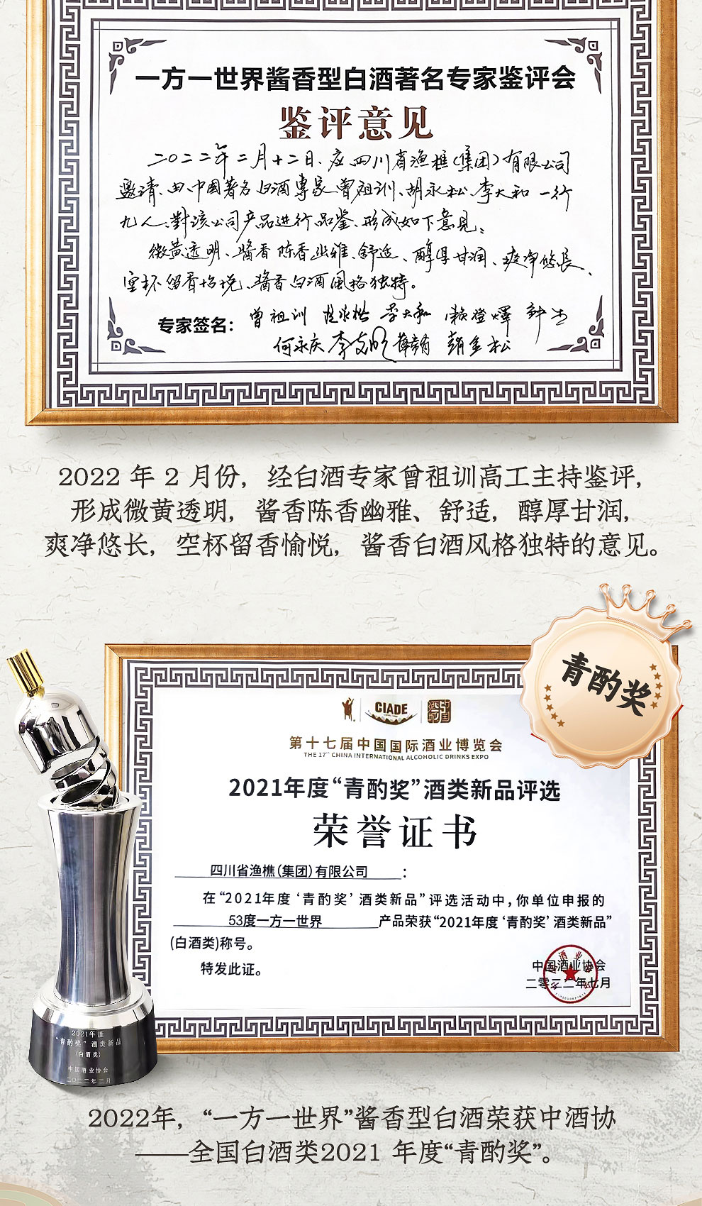 微黄透明,酱香陈香幽雅、舒适,醇厚甘润,爽净悠长,空杯留香愉悦,酱香白酒风格独特。