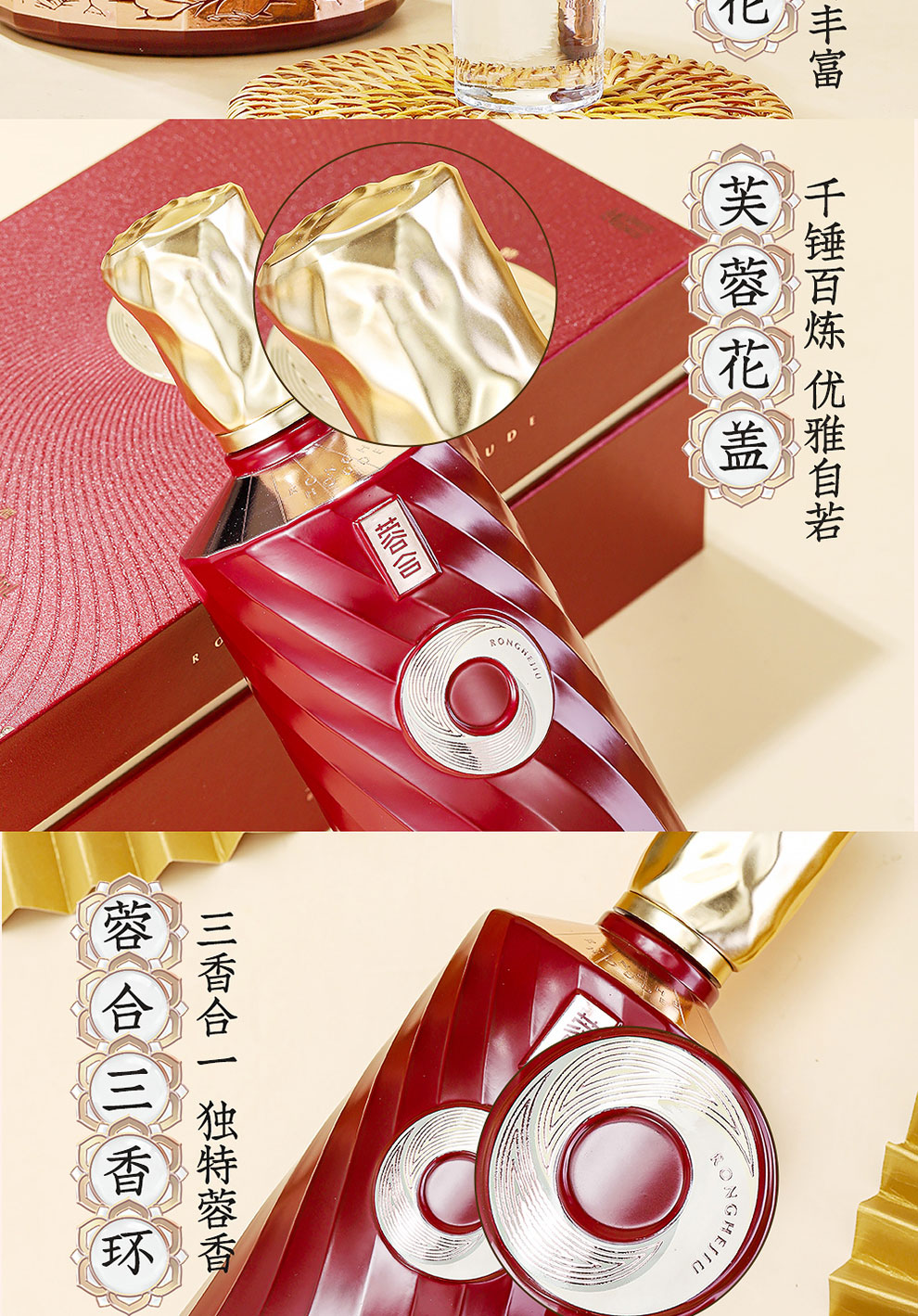 “蓉合”独特的超级视觉符号:蓉合三香环,其灵感来源于古老的金沙图腾太阳神鸟,以立体视觉述说浓清酱“三香合一”,在发酵过程中自然形成蓉香型白酒独特风格。蓉合莫比乌斯环:蓉合酿酒工艺传承与发展周而复始,生生不息。